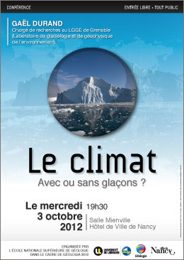 Une conférence sur le thème « Le Climat, avec ou sans glaçons ? » et animée par Gaël DURAND, du LGGE (Laboratoire de Glaciologie et de Géophysique de l’Environnement), s’est déroulée à la salle Mienville de l’Hôtel de Ville de Nancy.